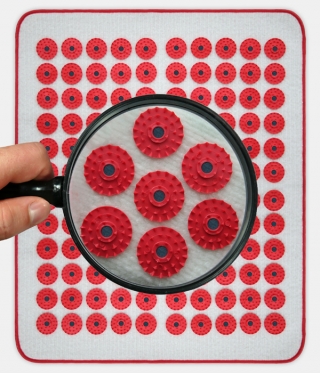 АКУПРЕС-М Постелка с магнити е средство за масаж, съчетаващо акупресура и магнитотерапия. Представлява мека текстилна възглавничка с размери 43/55 см., върху която са залепени пластмасови модули с шипчета и вградени магнити. Чрез модулите се постига механично въздействие върху акупунктурните точки на човешкото тяло. Това води до обезболяващ ефект в съоветната зона, както и до възстановяване нормалното протичане на жизнената енергия през тялото. Магнитното поле прониква в дълбочина на тъканите, като балансира функциите на всички органи и системи в организма.